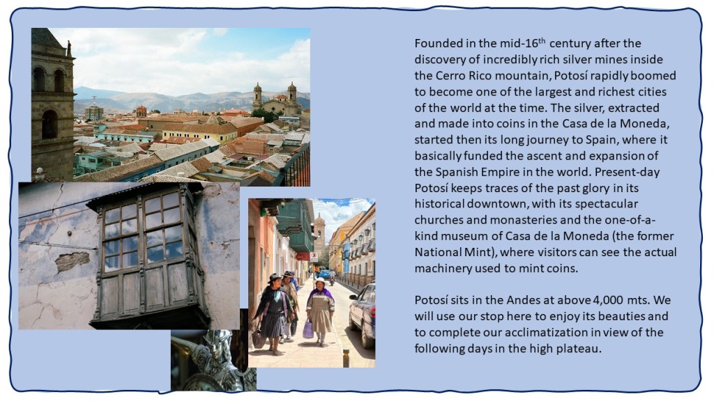 We will spend a busy morning with a slow-paced city tour of Potosí (at 4,000 mt high, no one really wants to run here). Potosí, the “imperial city” is a UNESCO world heritage and intriguing place where an important part of world history was made. We will walk around the historical downtown and its numerous grand churches and palaces, visit the national mint (Casa de la Moneda) that hosts the machinery used to make silver coins, and Santa Teresa monastery. We will also have scenic views of the incredible Cerro Rico and be able to take a glimpse of the chaotic growth of present-day Potosi, and the sharp contrast between past splendor and current reality. In the afternoon, transfer by private bus to Uyuni, the gateway to the immense Uyuni Salt Lake (“Salar de Uyuni”), again on a scenic route filled with geological formations painted in different colors.