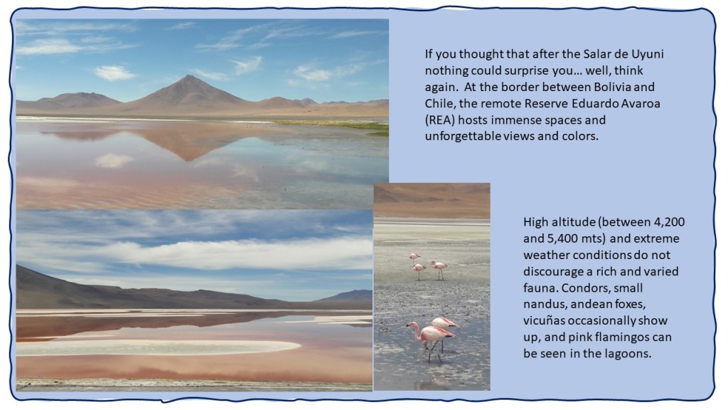 The second day of the high-altitude adventure gives us another sequel of natural wonders. We enter the Eduardo Avaroa Reserve (REA) and we border the Ollague volcano, travel through lava formations and the Siloli Desert. We see large flocks of pink flamingoes feeding in mirror-like lagoons and we visit the Laguna Colorada (Red Lagoon) with its incredible colors.