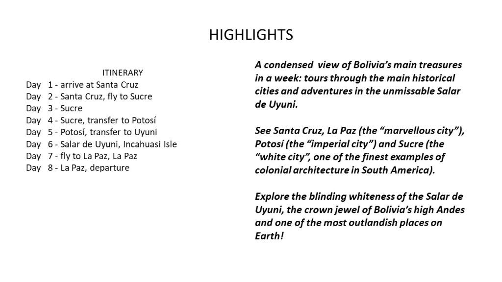 Bolivia historical cities, Oriente and Salar – Detailed itinerary