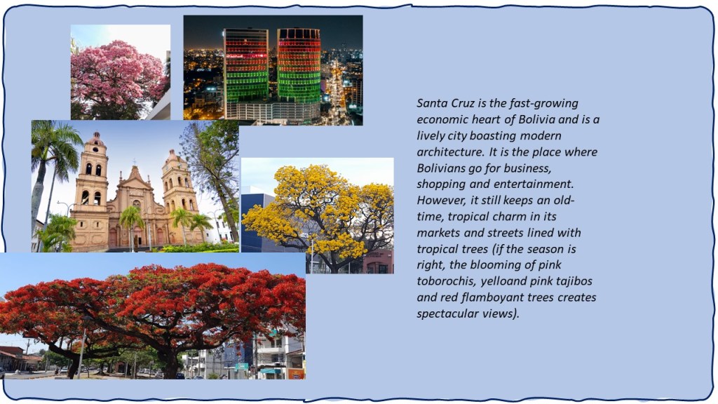 Visit Santa Cruz in the morning: downtown with its cathedral, coffee shops and cultural events, a street market and then the trendiest and most contemporary part of the liveliest and thriving city of Bolivia, the capital of the Oriente (Bolivia’ eastern region).