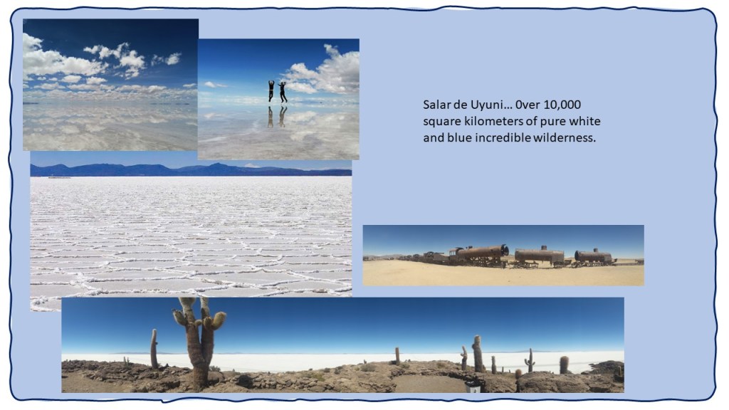 And here it is! Today, we really are going to visit an outlandish place: the Salar de Uyuni, the largest salt lake in the world and a Unesco World Heritage. We will drive into this white, immense, empty space where the horizon, the sense of distance and proportions get confused. Even our cameras seem unable to sort out what is close and what is far. We will visit the Incahuasi island, in fact a rock formation that seems to emerge from the whiteness like an island. During the day, we will also stop at the salt crossway, the abandoned salt hotel and a ghostly train cemetery.