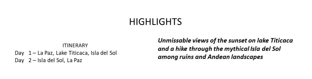 Important note: the proposed itinerary and timetable assumes the use of public ferries between harbors in Isla del Sol and between the island and mainland, which are very limited in number and at fixed hours. When customizing the private tour, it is also possible to consider using private boats to allow a different or more flexible timetable.